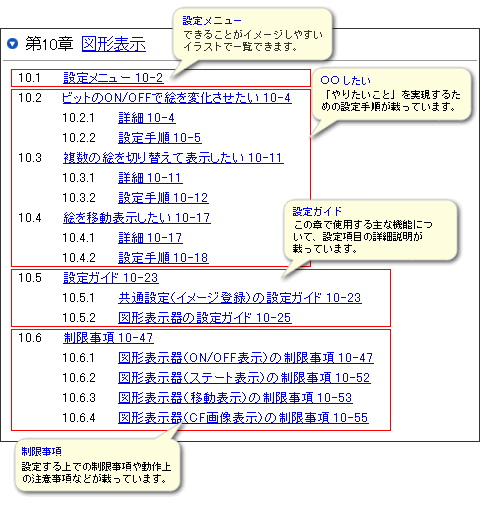 リファレンスマニュアルの各章は、主に次のような構成になっています。