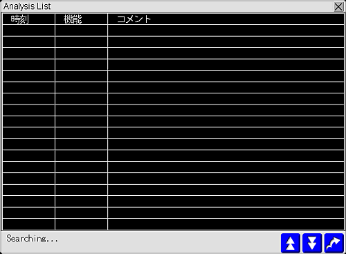 [START]をタッチします。検索処理が始まると解析リスト画面に切り替わり、「Searching…」の文字が点滅表示されます。システム変数「#H_AlarmSyncStatus」のビット0(解析動作中)がONになります。