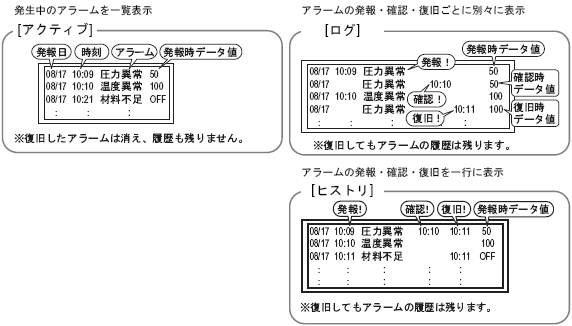 表示モードが[ヒストリ]の場合、発報時のデータのみ表示されます。