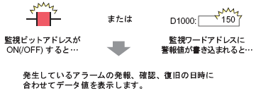 監視するビットアドレスがON(/OFF)、または監視するワードアドレスに警報が書き込まれると、アラームの発報、確認、復旧の状態に合わせて指定したアドレスのデータを取得します。データを解析することで、アラーム発生の原因を短時間で特定することができます。