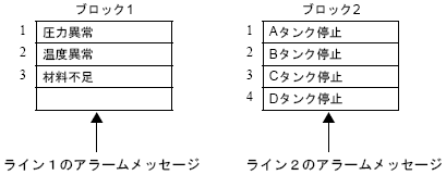 アラームメッセージを分類してブロックに登録しておくことで、画面ごとに表示するブロックを切り替えることができます。また同じ画面上で、接続機器から表示するブロック番号を切り替えて表示させることもできます。