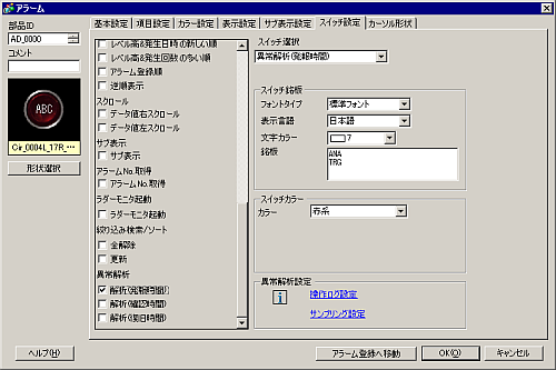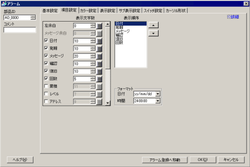 配置したアラーム部品をダブルクリックすると、設定ダイアログボックスが開きます。