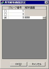 共通設定[サンプリング設定]を開きます。[異常解析設定]をクリックして、異常解析の対象としたいサンプリンググループに異常解析画面番号を設定します。(例 : グループ番号「3」、異常解析画面番号「8000」)