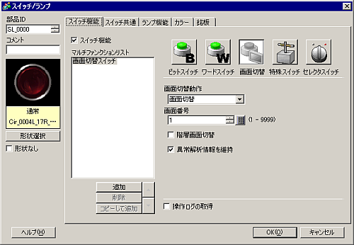 次に画面切替用のスイッチを配置します。[部品]メニューの[スイッチランプ]から[画面切替スイッチ]を選択するか、