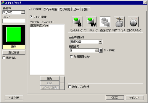 配置したスイッチをダブルクリックすると、設定ダイアログボックスが開きます。