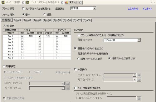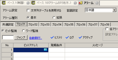 [ブロック設定]でメッセージを登録するブロックの、使用する表示モード(ヒストリ/ログ/アクティブ)にチェックを入れ、それぞれの履歴記憶数を設定します。