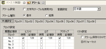 [ブロック設定]でメッセージを登録するブロックの、使用する表示モード(ヒストリ/ログ/アクティブ)にチェックを入れ、それぞれの履歴記憶数を設定します。