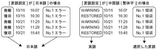 「発報」、「復旧」などの状態が、アラームメッセージの言語を日本語に設定している場合は日本語で、日本語以外(欧米、韓国語、中国語(繁体字)、中国語(簡体字)、ロシア語(キリル)、タイ語)の場合は英語で自動的に出力されます。