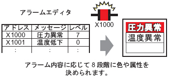 各アラームメッセージに重要度レベルを0(重要度低い)~7(重要度高い)で設定します。初期値は「0」です。アラーム部品で各レベルの発報カラー、確認カラー、復旧カラーがそれぞれ設定できます。