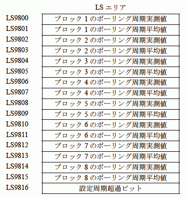 ポーリング周期の実測値(秒)と平均値(秒)は、ブロックごとに以下の内部デバイスアドレスに格納されます。また、設定されたポーリング周期を一度でも実測値が超えた場合、設定周期超過ビットをONします。一度ONされたビットは設定されたポーリング周期を実測値が下回った場合でもOFFしませんので、OFFしたい場合は手動で行ってください。