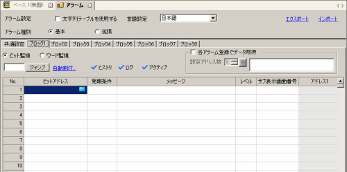 [アラーム種別]で[拡張]を選択している場合、[ユニット数]で設定したユニットの数だけ列が挿入されます。ユニット名は半角32文字以内で設定が可能です。文字列テーブルのデータを使用することもできます。アラーム発生時には、「ユニット名+メッセージ」がアラームメッセージとして表示されます。