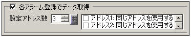 データ値を取得するアドレスの数を1~8で設定します。設定したアドレス数分、[同じアドレスを使用する]設定行が追加されます。アラーム登録一覧ではアドレス設定列が入力可能となります。