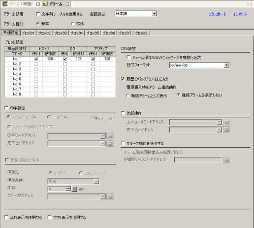[拡張]を選択すると、登録できるアラームメッセージ数や記憶数を次のように増やすことができます。また[累積・回数の保持]の設定や、各ブロックごとに[ユニット数]、[ポーリング周期]の設定ができます。