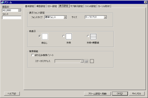 アラーム部品の枠表示を[枠なし]、[外枠]、[外枠+横罫線]から選択します。