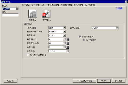 [ブロック指定]で[直接]を選択した場合、表示したいアラームメッセージが登録されているブロックを[ブロック1]~[ブロック8]から選択します。[ブロック指定]で[アドレス]を選択した場合、表示したいブロックを指定するアドレスを設定します。