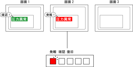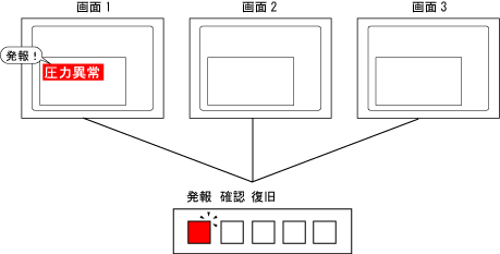 表示器全体のアラーム履歴をイルミネーションスイッチで監視/操作します。EZイルミネーションスイッチの各スイッチにアラームの状態(発報/確認/復旧のうちのいずれか1つ)を割り付けます。
