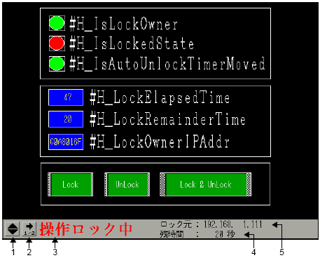 ロック元の表示器にはロック状態を示す表示がされないため、意図せずロックをかけてしまっても、その表示器からは確認ができません。ロック元の表示器で状態確認をするには、操作ロックスイッチにランプ機能を追加してください。ランプ機能にシステム変数「#H_IsLockOwner」を割り付けて、ロックと解除で切り替えができるように状態設定をすればロック元表示器からもロック状態が確認できます。