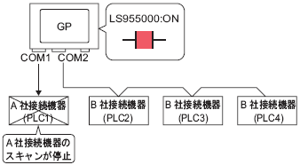 運転モード中に一部の接続機器との通信を停止させることができます。通信スキャンをコントロールするアドレスで、停止したい接続機器に該当するビットを操作すると、通信の停止/再開が行えます。