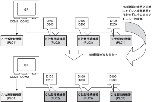 COM1 : A社接続機器、PLC1(例 : オムロン(株)製、CS/CJ シリーズ 上位リンク) COM2 : C社製接続機器3台(例 : 横河電機(株)製、パソコンリンクSIO 3台) |