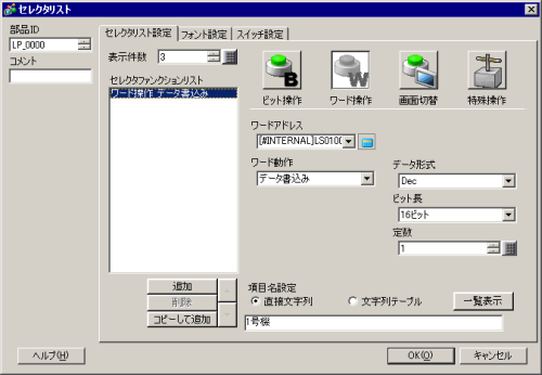 [ワード操作]を選択し、[ワードアドレス]に「LS0100」を設定します。