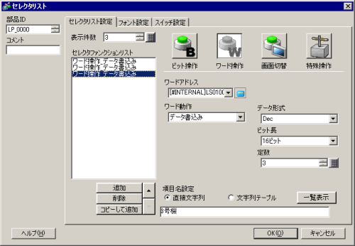 [ワード動作]で[データ書込み]を選択し、[定数]は「1」を設定します。[項目名設定]に「1号機」と入力します。