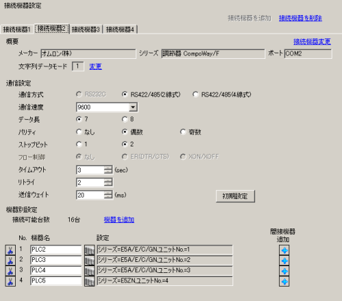 間接機器の行が追加され、[PLC2]、[PLC3]、[PLC4]の行に[機器ID]列が表示されます。