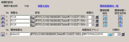 [機器別設定]の[PLC2]列の右横にある[間接機器追加]ボタン