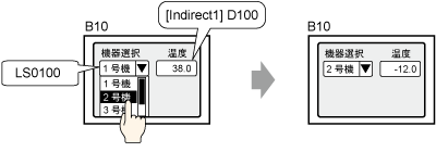 データ表示器で間接機器「Indirect1」のアドレス(D100)を指定しておく。
