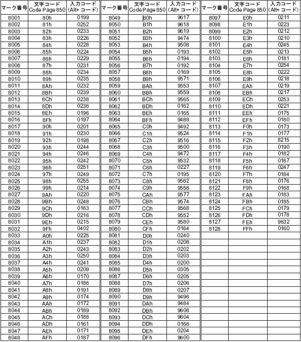 マーク番号8001~8128に描いたマークは、文字コード80h~FFhの文字として扱われます。例えば、8001は80hに、8002は81hに対応します。