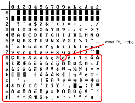 作成した文字は、文字コード表の枠内の文字と入れ替えることによって画面上に表示させることができます。文字コード表(Code Page 850)の文字「e」(89h)とドットで作成した「Ⅲ」の文字の入れ替えを行い、作成した「Ⅲ」の文字を表示器画面上に表示させる手順を示します。
