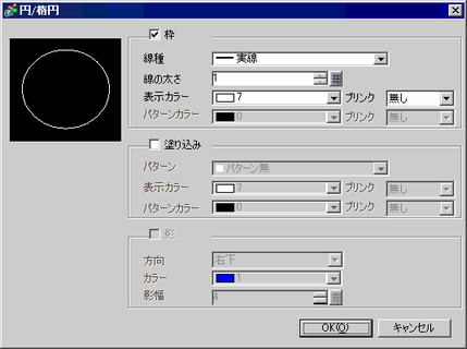 をクリックして画面に配置します。配置した[円/楕円]をダブルクリックすると次のようなダイアログボックスが表示されます。