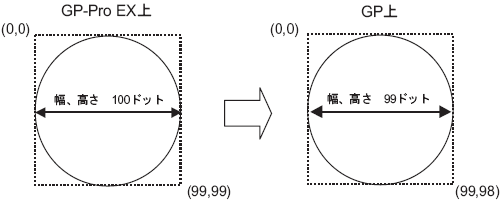 円/楕円の幅(または高さ)を偶数で指定した場合、表示器上では1ドット小さく表示されます。