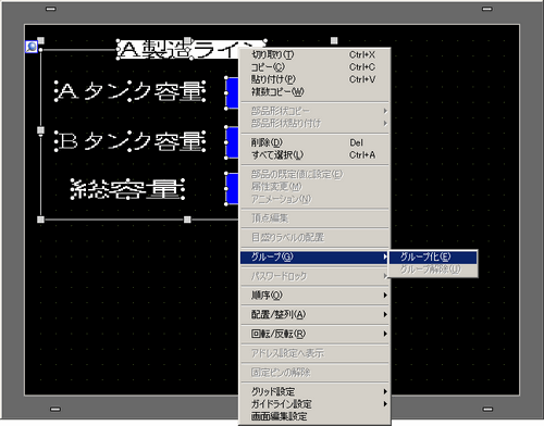 複数のオブジェクトをひとまとめにし、1つのオブジェクトとして扱うことができます。操作手順は、オブジェクトをまとめて選択した状態から右クリックし、[グループ(G)]メニューから[グループ(E)]をクリックします。[グループ解除(U)]をクリックすると、グループ化したオブジェクトを解除することができます。