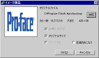 次のような[イメージ部品]ダイアログボックスが表示されるので、貼り付ける画像のサイズやブリンクの設定を行います。