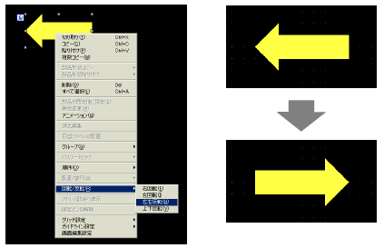 オブジェクトの中心線を基準にX軸対称(上下)またはY軸対称(左右)に反転させることができます。反転したいオブジェクトを選択した状態から右クリックし、[回転/反転(R)]の[左右反転(H)]、[上下反転(V)]から選択します。以下の例では多角形を左右回転した場合の配置になります。ただし、呼び出した画面やマーク、部品、文字列などは表示位置のみ対称移動されます。