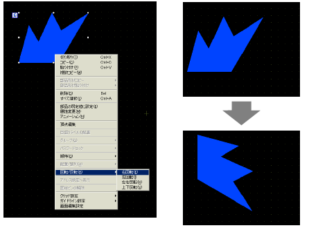 オブジェクトを90度単位で左右に回転させることができます。回転したいオブジェクトを選択した状態から右クリックし、[回転/反転(R)]の[右回転(E)]、[左回転(I)]から選択します。以下の例では多角形を右回転した場合の配置になります。