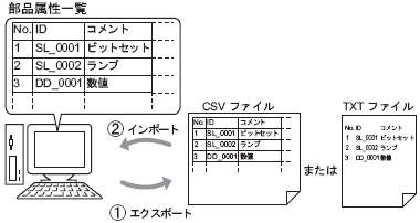 部品の属性一覧をファイルに出力して属性を編集し、変更したデータを元のファイルにインポートします。