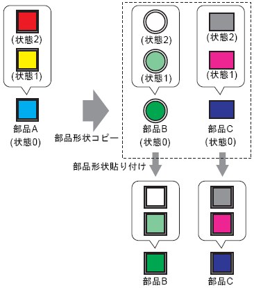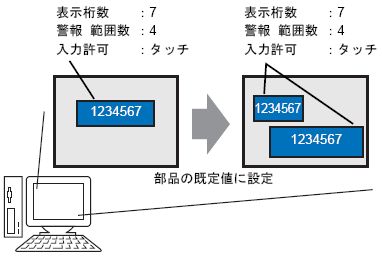 配置した部品や図形の属性を既定値として設定しておくと、異なる画面でも部品や図形を配置したときに、同じ属性になります。