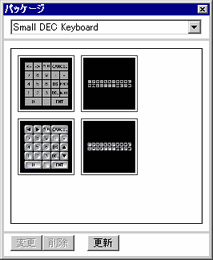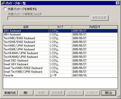 GP-Pro EXに登録されているパッケージファイルの一覧を表示します。パッケージファイルには、作成したオリジナルの部品や描画などをパッケージとして登録できます。パッケージファイルをインポート/エクスポートすることで、複数の開発環境(作画を行うパソコン)で同じパッケージを使って作画することができます。
