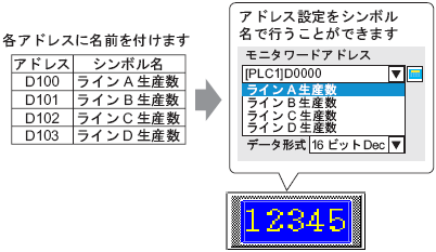各アドレスに自由な名前を付けて管理することができます。(この名前を「シンボル」と呼びます。)部品などのアドレスをシンボルで設定することができます。それぞれのシンボルに対するアドレスを変更すると、部品を設定し直すことなく、アドレスの変更が一括で行えます。