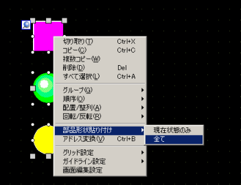 [Shift]キーを押しながら形状を貼り付けたい部品を選択し、右クリックして表示されたメニューから[部品形状貼り付け]-[全て]をクリックします。