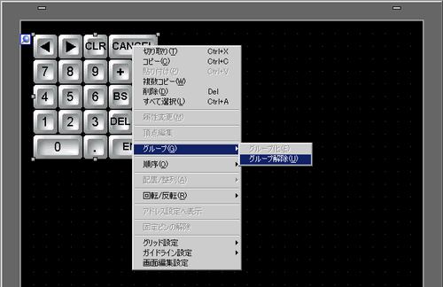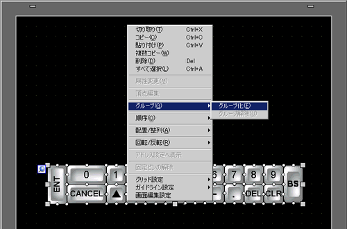 配置したキーボードを選択し、マウスの右をクリックして[グループ(G)]から[グループ解除(U)]を選択します。[グループ解除]をすることにより、キー1つずつ設定ができるようになります。