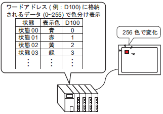 ワードアドレスに格納されたデータを見て、1つのランプで色分け表示します。最大256個の状態を切り替えて表示できます。