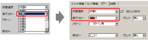 [カラー]タブをクリックし、17個の状態ごとにランプの表示色をそれぞれ指定します。[状態選択]で[状態0]を選択し、[表示カラー]を以下のように指定します。