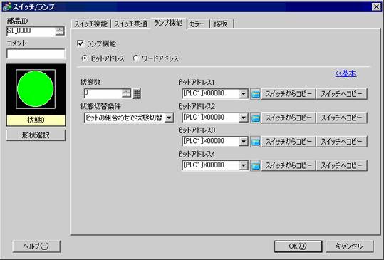 [ビットの組合わせで状態切替]を選択していて、ビットのON/OFFの組み合わせが[状態数]以外の組み合わせになる場合、ランプは正常に表示されません。例えば[状態数]が3の場合、[状態0]~[状態2]までの3パターンの設定ができますが、ビット1およびビット2がONになっていると[状態3]に該当するため、設定外となりランプの状態は更新されません。また[状態3]の間に、別の画面からランプのある画面に画面切替を行うとランプ自体が表示されません。