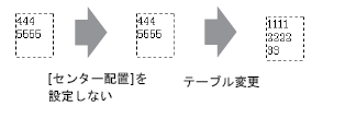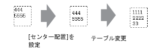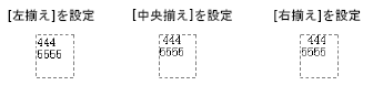 文字列テーブルで複数の文字行数を設定した場合、文字数の最も多い行(下図では2行目「5555」)を基準にしてほかの行を整列([左揃え]、[中央揃え]、[右揃え])できます。