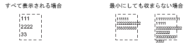 [ストロークフォント]選択時に、[文字サイズ自動調整]を設定した場合、指定した最小サイズまで文字を小さくして表示します。ただし、最小サイズにしても枠に入りきらない場合、はみ出した文字は表示されません。