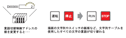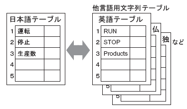 変更したい文字列に相当する他言語の文字列をあらかじめ文字列テーブルに登録しておくと、システムの運転中でも文字列の言語を変更できます。(翻訳機能はありません)