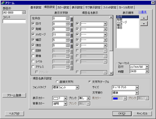 アラーム部品に表示する項目のうち、項目名を表示したいものにチェックを入れます。