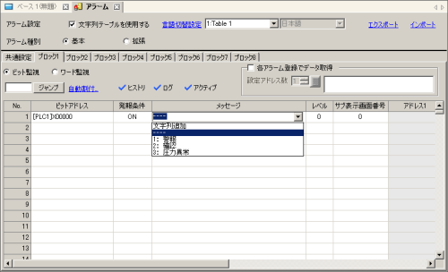 [言語設定]や[文字列テーブルを使用する]の設定は、すべてのアラーム(アラーム履歴の各ブロック、流れ表示、サマリ表示)に共通です。直接入力したメッセージと文字列テーブルから参照したメッセージを同時に表示させることはできません。